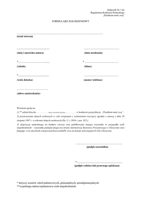 1. Przekazuj±c pracê poetyck± na konkurs, uczestnik zgadza siê na ekspozycjê wiersza oraz publikowanie swojego wizerunku (w przypadku osób niepe³noletnich – wizerunku podopiecznego) na stronie internetowej Starostwa Powiatowego w Choszcznie oraz fanpagu: www.facebook.com/powiatchoszczenskiPL