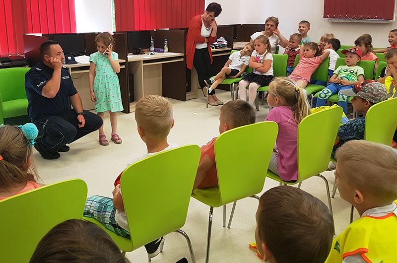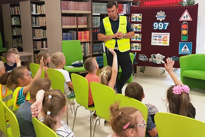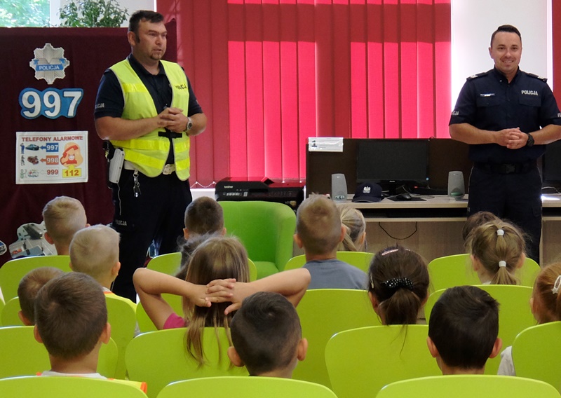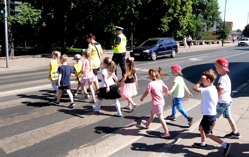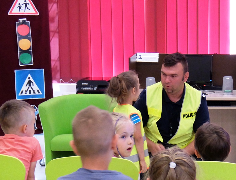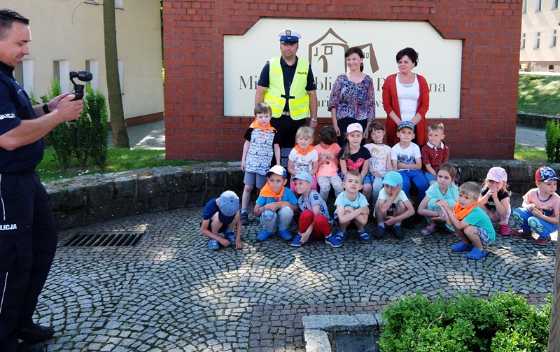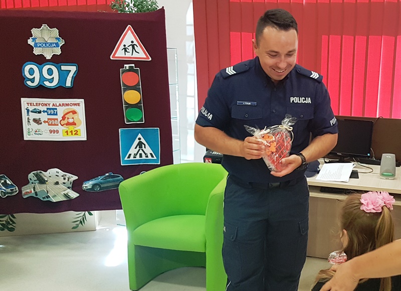 | Podkreślili również ważną rolę, jaką pełnią elementy odblaskowe. Na koniec przeprowadzili krótki egzamin z przechodzenia przez pasy. Dzieci zdały go rewelacyjnie. Równie dobrze poradziły sobie z zadawanymi przez stróży prawa pytaniami na temat bezpiecznej zabawy, a także wykazały się znajomością numerów alarmowych i umiejętnością wzywania pomocy. Z dużym zainteresowaniem słuchali rad i wskazówek zaproszonych gości, chętnie dzieląc się swoimi spostrzeżeniami.