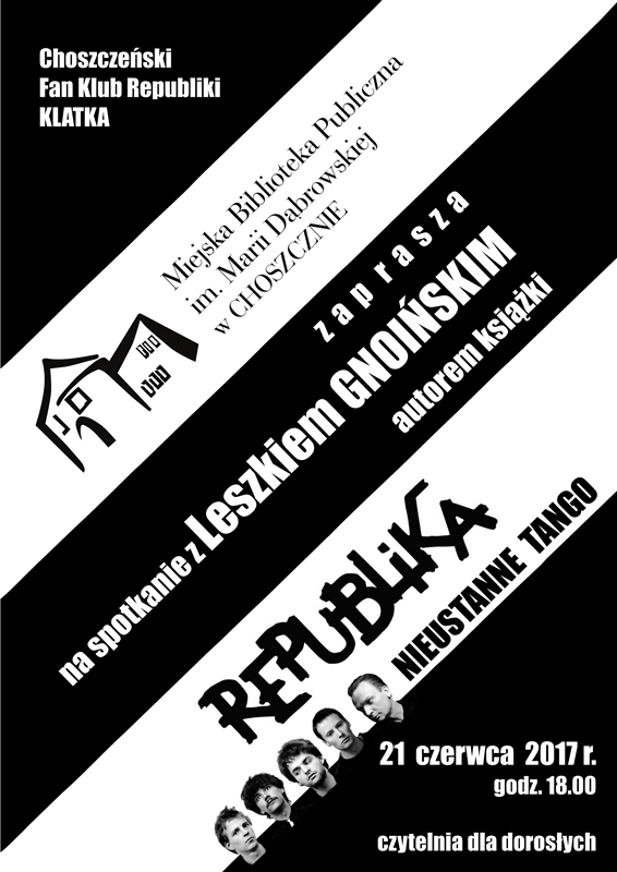 W ¶rodowe popo³udnie, w choszczeñskiej bibliotece odby³ siê „zlot fanów” Republiki. Leszek Gnoiñski, dziennikarz muzyczny, autor ksi±¿ki „Republika : nieustanne tango”, opowiedzia³ o swojej publikacji i o tym, jak zbiera³ do niej materia³y. Wtedy pozna³ Artura Szubê, który w latach 80-tych za³o¿y³ fanklub zespo³u Republika – „Klatka” razem z kolegami Tomaszem Kancelarczykiem i W³adys³awem Szlachtowiczem. Ca³a trójka wielbicieli Republiki i jej lidera Grzegorza Ciechowskiego, wspomina³a jak trudno by³o w czasach PRL-u zdobyæ p³yty ulubionego zespo³u oraz jak du¿e wra¿enie zrobi³y na nich teksty frontmana tej grupy.