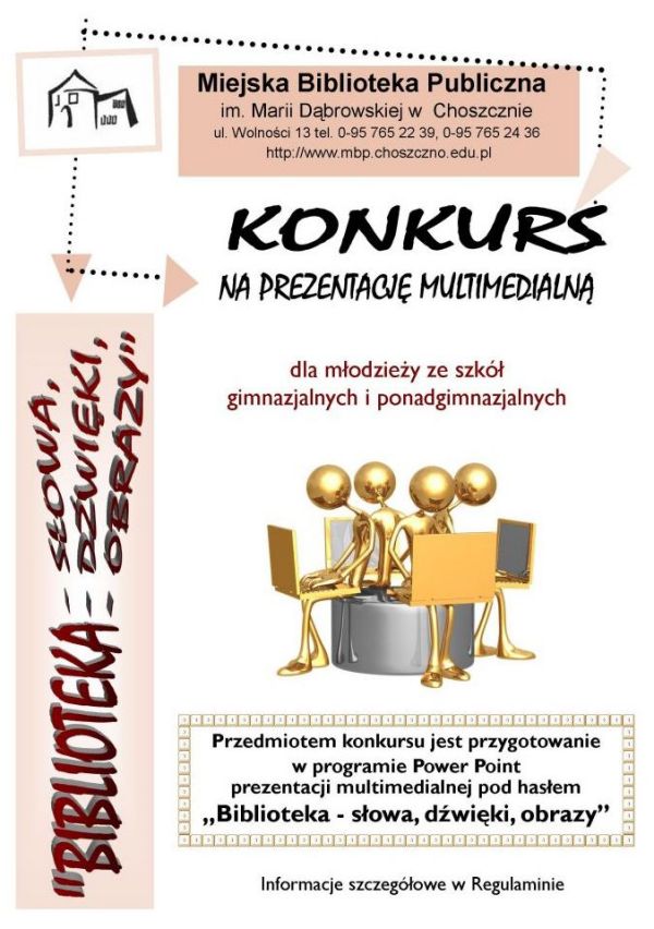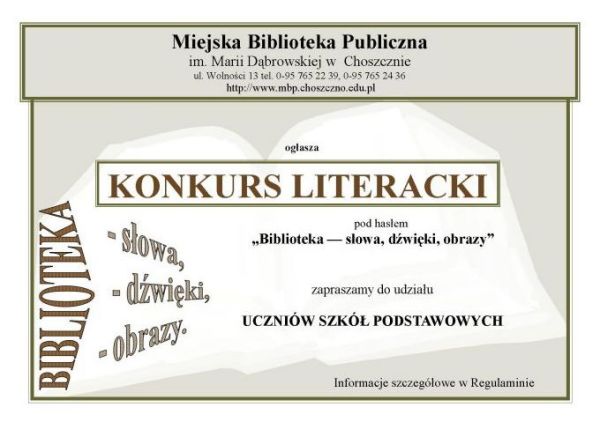 Tegoroczny Tydzieñ Bibliotek obchodzony bêdzie pod has³em "BIBLIOTEKA - s³owa, d¼wiêki, obrazy" , które stanowi równie¿ punkt wyj¶cia dla m³odzie¿y zainteresowanej udzia³em w konkursie na prezentacjê multimedialn±.