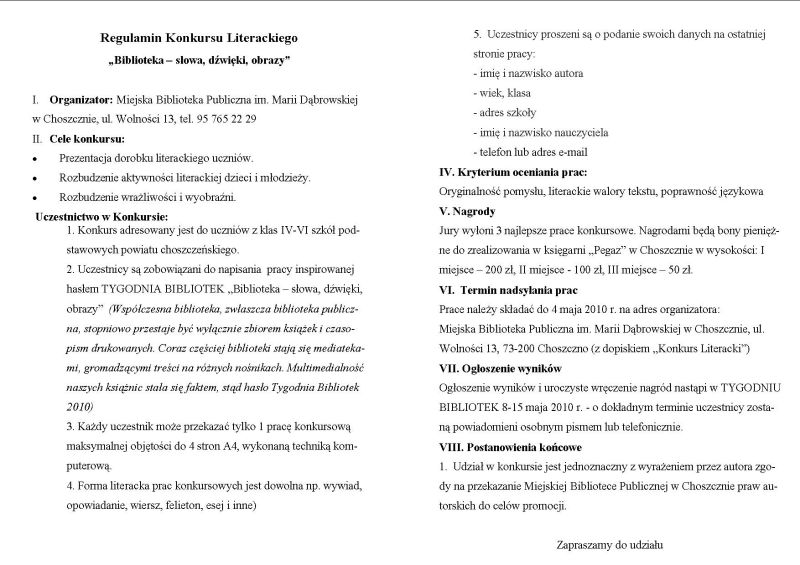 Uczniów szkół podstawowych zapraszamy do udziału w Konkursie Literackim pod hasłem "Biblioteka - słowa, dĽwięki, obrazy"