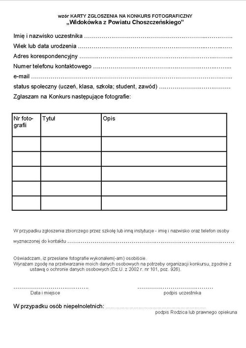 Udział w konkursie następuje z chwilą dostarczenia fotografii wraz z kartą zgłoszenia wg wzoru: