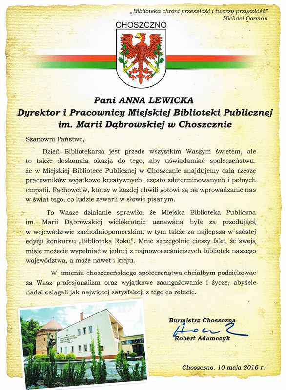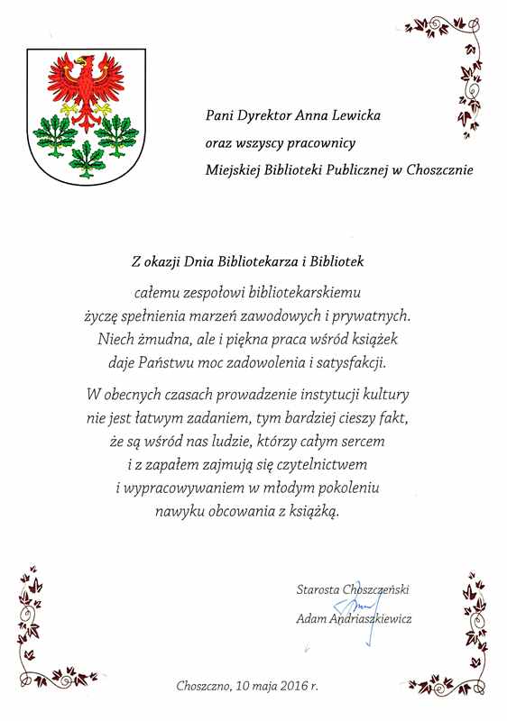 8 maja przypada Dzień Bibliotekarzy i Bibliotek. ¦więto obchodzone jest od 1985 roku. Z tej okazji bibliotekarze z całego naszego powiatu spotkali się przy kawie z władzami samorz±dowymi: Starost± Choszczeńskim Adamem Andriaszkiewiczem i Burmistrzem Choszczna Robertem Adamczykiem.
