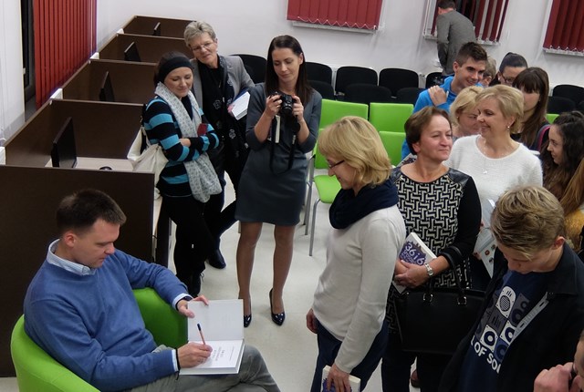 19 października nasza biblioteka była otwarta do godziny 23:00. Takiej frekwencji jeszcze nie odnotowaliśmy na żadnym spotkaniu autorskim, a „sprawcą tego zamieszania” był Szymon Hołownia.